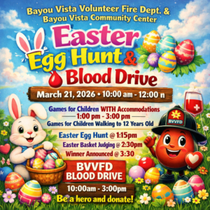 The Bayou Vista Volunteer Fire Department & Bayou Vista Community Center invite you and your family to a fun-filled morning of Easter excitement while giving back to the community!