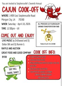 Stephensville’s Seventh Annual Cajun Cook-Off will be held on Saturday, April 18th at Noon at 1409 East Stephensville Rd. in Stephensville. All proceeds go to Jerusalem Shriner Transportation Fund. Go on out and enjoy live music by Driftwood, DJ Dollar Bill, and DJ Ronnie G. Enjoy great food and good company. If you wanna enter a team, its only $100. Cook your favorite dish, make sure food is ready for Noon. Contact Tommy Hebert for more details (985) 856-2514.